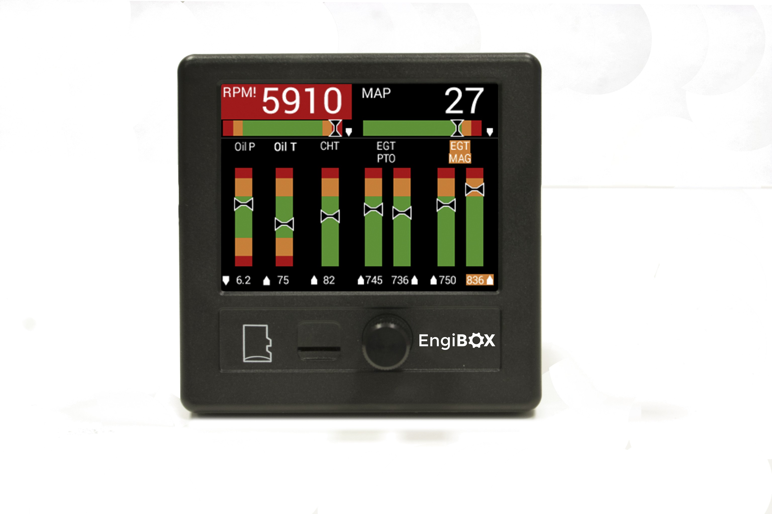 AvMap vous présente l'EngiBox, un EMS (Système de contrôle de moteur - Engine Monitoring System) de faible dimension (diamètre standard de 80 mm avec un boitier 95 x 95 mm sur le tableau de bord) et très léger (250 g), pour la gamme ROTAX