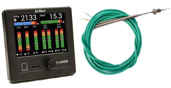 EngiBOX est un système de surveillance du moteur affichant EGT, RPM, MAP, Pression d'huile, Température huile / Température air, CHT / Température du liquide de refroidissement.