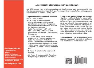 «?234 Fiches Pédagogiques de radionavigation?» est le résultat d’un travail pédagogique approfondi destiné à aider tous les pilotes soucieux de la qualité de leur pilotage et de leur sécurité. Sans commentaires superflus, ce qui est primordial est soigneusement expliqué avec simplicité pour que chacun puisse comprendre et mesurer l’utilité d’une bonne connaissance des procédures. Ainsi, les pièges les plus classiques et les erreurs fréquentes pourront être évités.