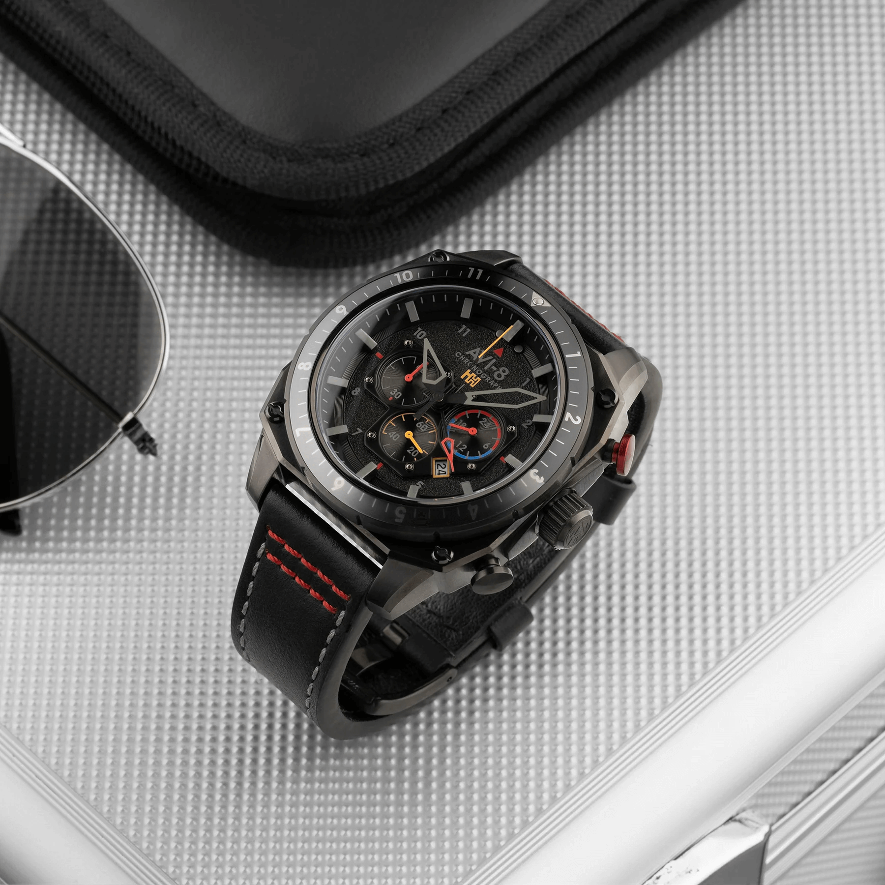 La Hawker Hunter Atlas Dual Time Chronograph marie l'héritage des avions à réaction à une technologie de pointe. Elle combine un mouvement chronographe japonais, un boîtier en acier de 43 mm, un verre minéral anti-reflet, des index appliqués, un bracelet en cuir de 22 mm, une étanchéité jusqu'à 5 atm et un poids de 140 g.