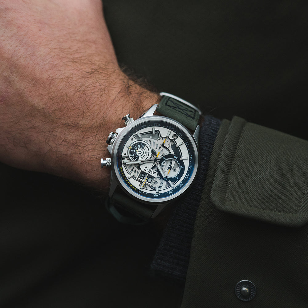 La chronographe AVI-8 Matador incarne une fusion élégante entre l'histoire aérienne et l'ingénierie horlogère contemporaine. Inspirée par le légendaire Hawker Harrier "Jump Jet", cette montre transcende le simple appareil chronométrique pour devenir un hommage captivant à l'aviation.