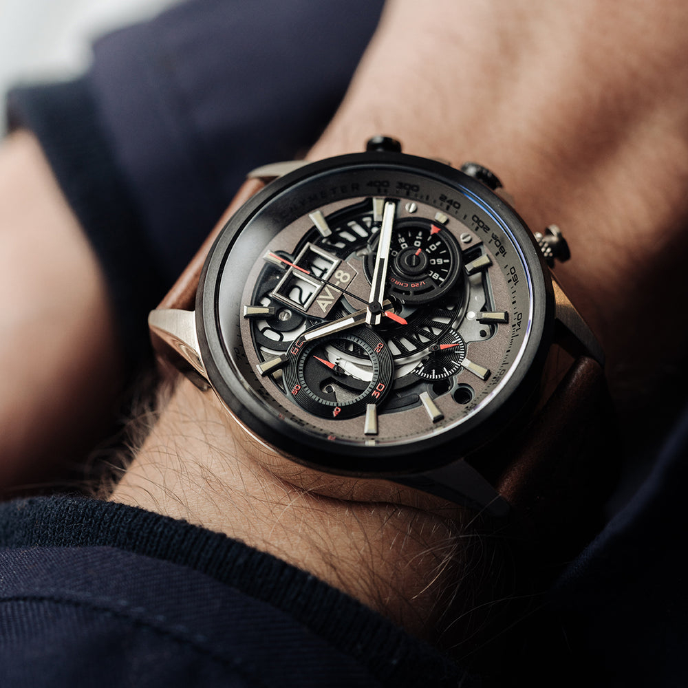 Le chronographe AVI-8 Matador incarne une fusion élégante entre l'histoire aérienne et l'ingénierie horlogère contemporaine. Inspirée par le légendaire Hawker Harrier "Jump Jet", cette montre transcende le simple appareil chronométrique pour devenir un hommage captivant à l'aviation.