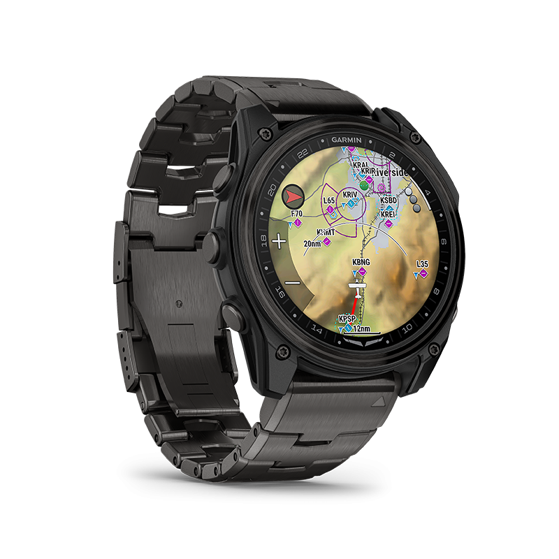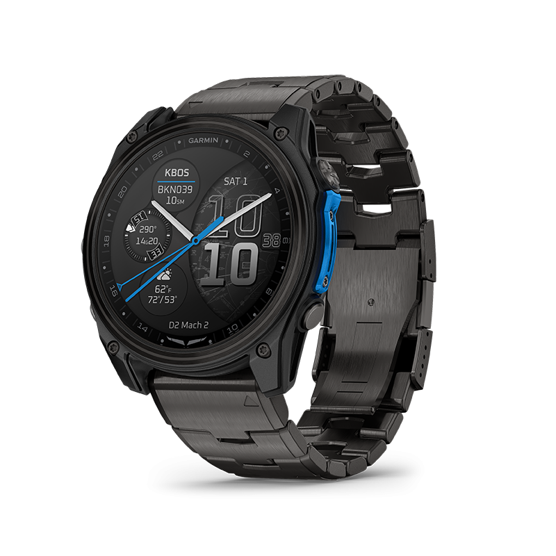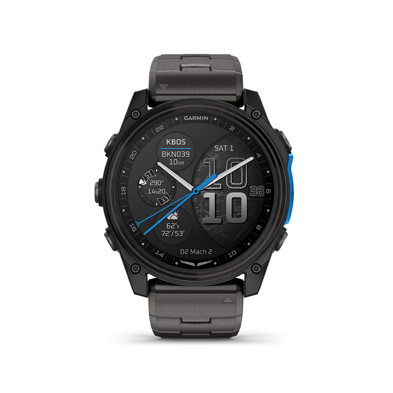 Montre GPS aviateur Garmin – D2™ Mach 2 : smartwatch aviation haut de gamme déclinée en 47 mm Titane et 51 mm Carbone DLC – écran AMOLED lumineux 1,4’’ – navigation directe, HSI, METAR/TAF, alertes de sécurité – cartographie aéronautique complète – lampe torche LED blanche/rouge avec mode vision nocturne – haut-parleur et micro intégrés – connectivité Bluetooth® et commandes vocales – fonctions santé et sport avancées (ECG, SpO₂, Body Battery™, sommeil, respiration, stress) – autonomie jusqu’à 26 jours – bracelets QuickFit® cuir, silicone ou titane selon version