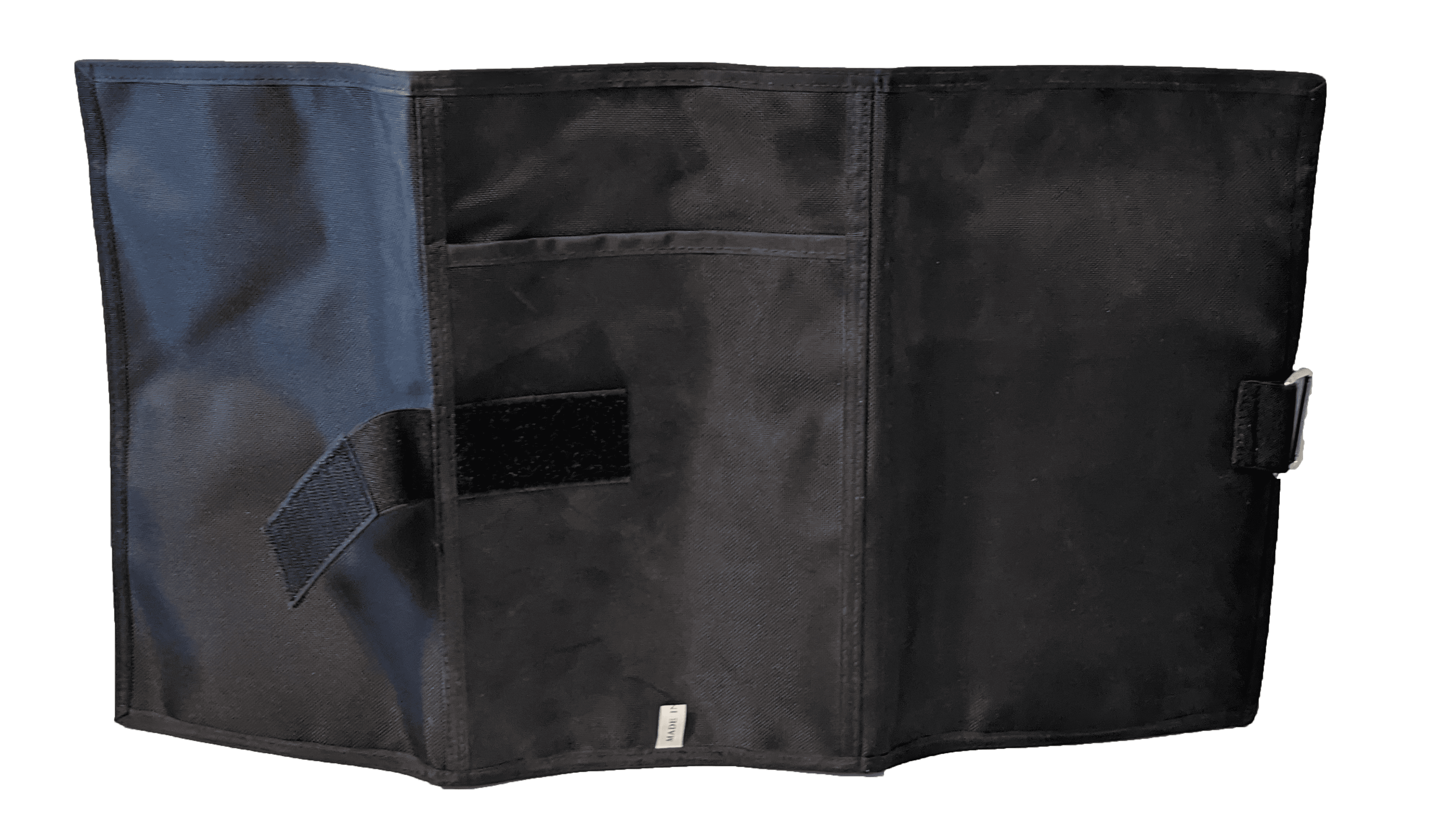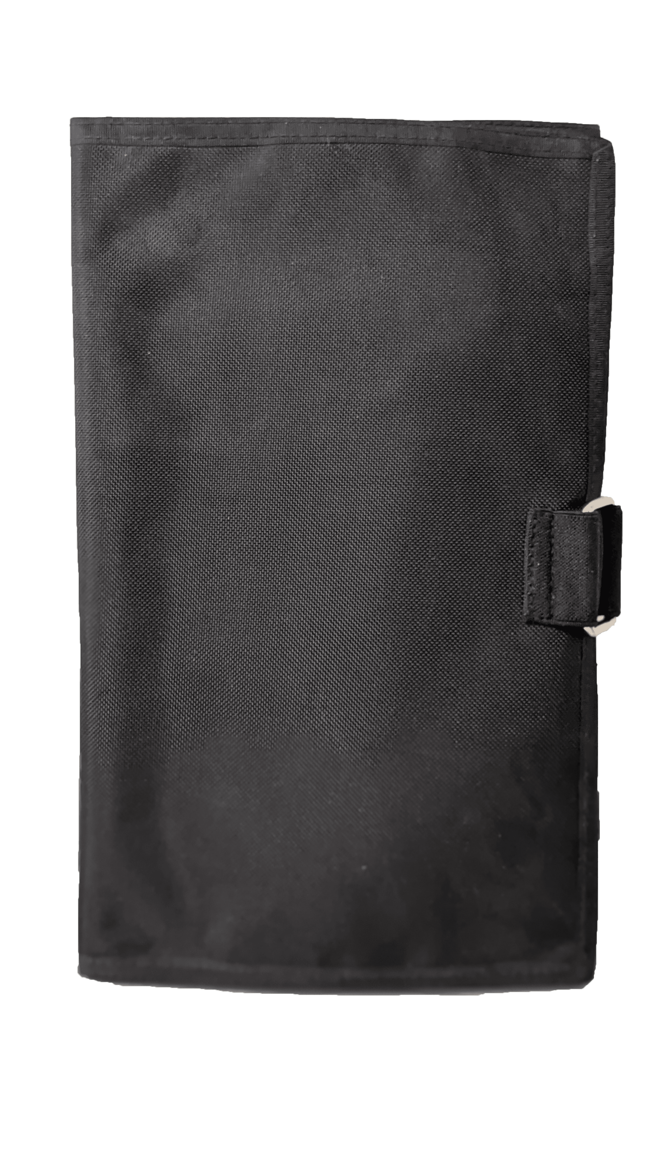 Pochette porte documents en tissu matelassé ultra résistant, avec anneau métal et fermeture en velcro.