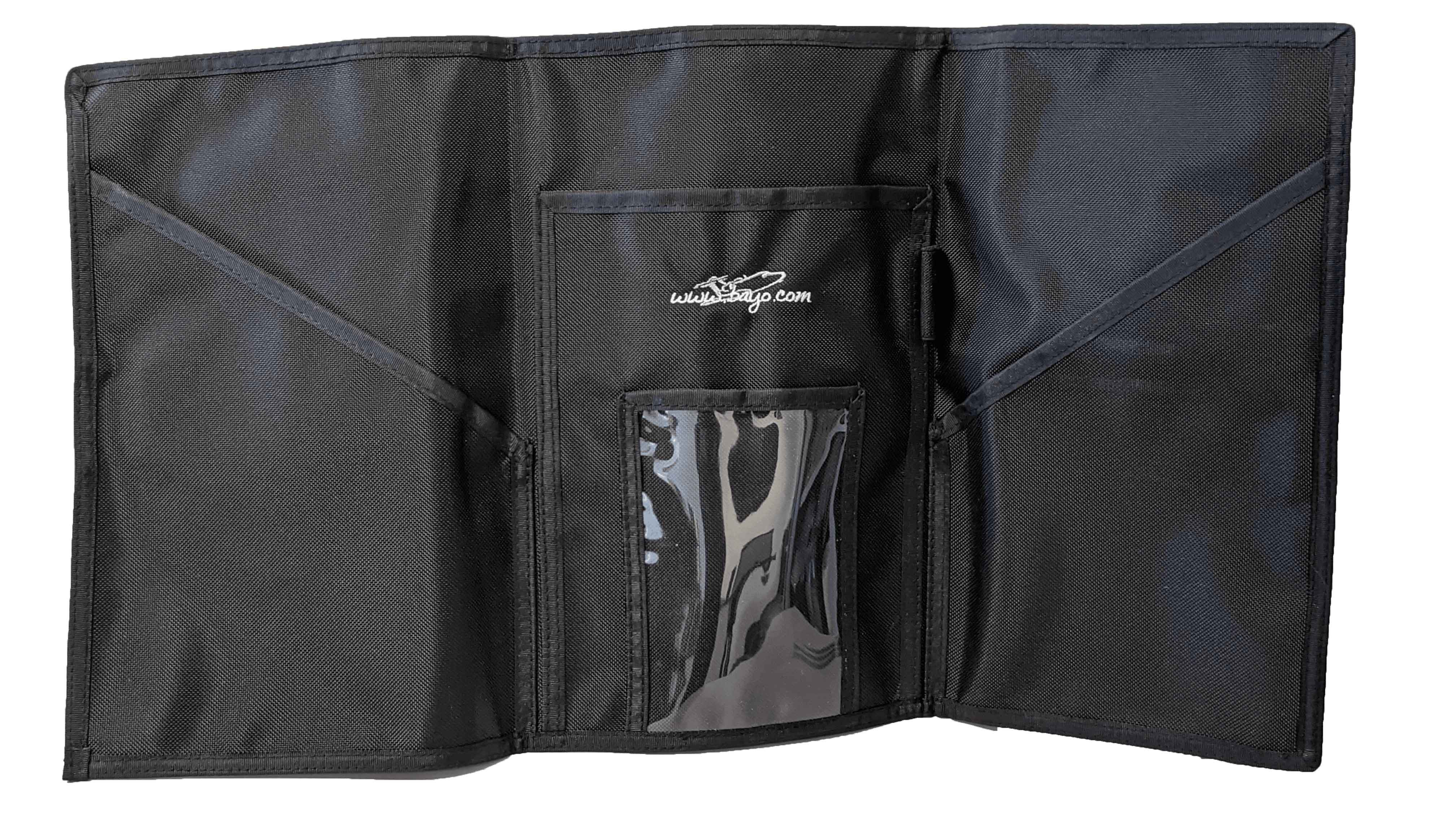 3 Volets, avec 3 grandes poches intérieures, 1 petite poche centrale transparente, et 1 grande poche au dos (accessible pochette refermée).